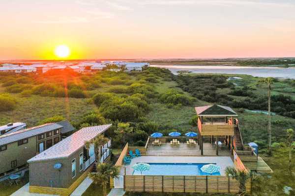 We have stunning sunset views overlooking the gorgeous wetlands of the port aransas nature preserve a sparkling clean pool with deck space for gathering with your friends tiny houses right on property for rent and spacious spots for comfort during your stay.
